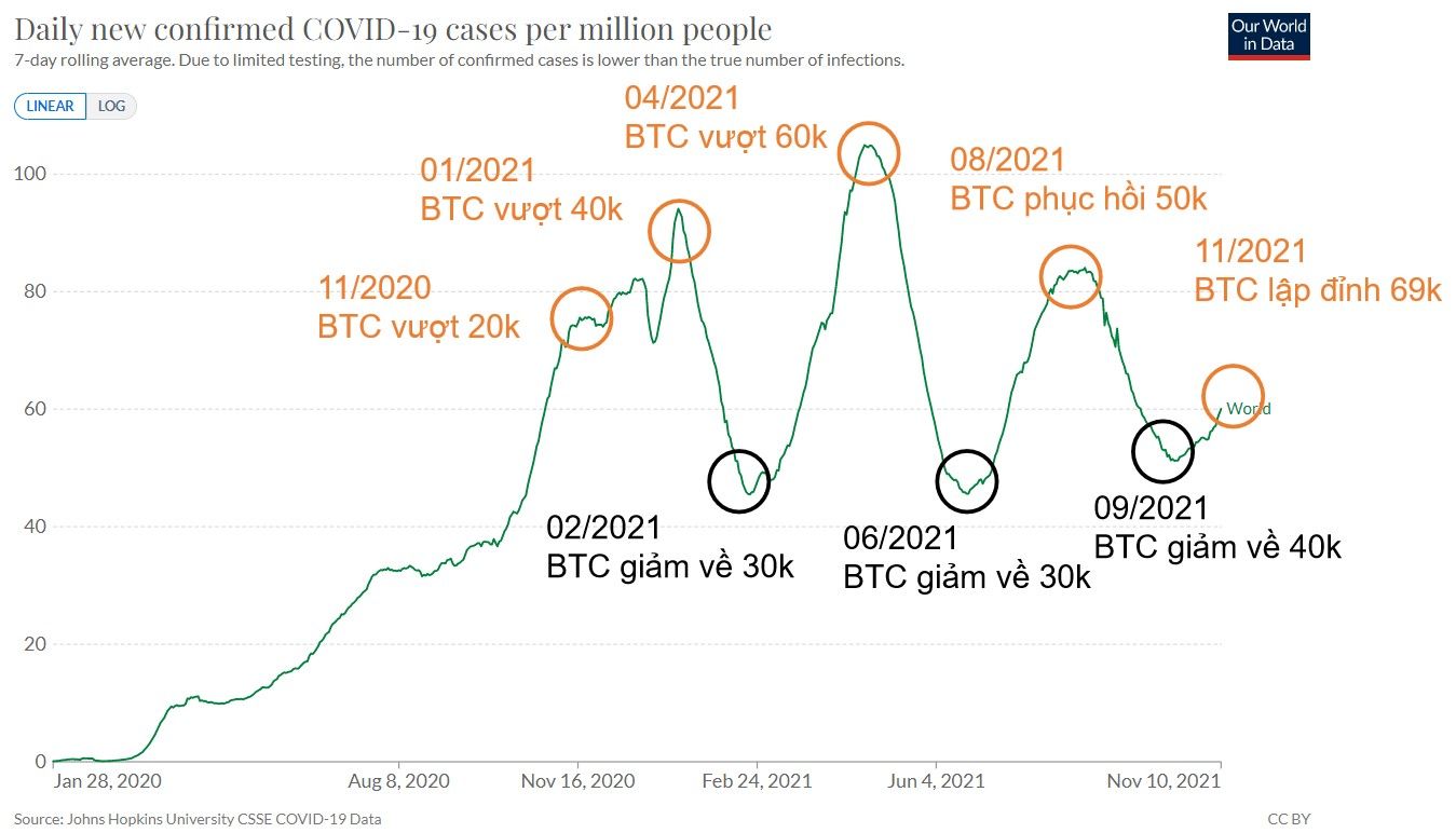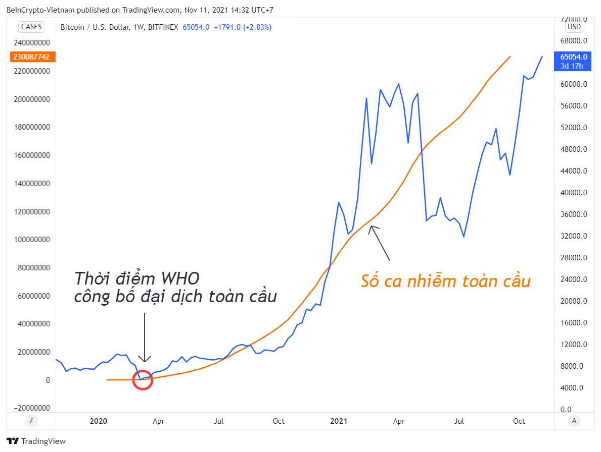 COVID-19 và Bitcoin không bùng nổ vào chung một thời điểm. Nhưng nếu tính từ thời điểm tháng 3/2020 – thời điểm WHO công bố đại dịch toàn cầu – thì số ca COVID và giá Bitcoin cùng đi theo một hướng.