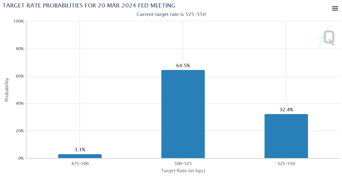 Xác suất FED sẽ thực hiện đợt cắt giảm lãi suất lần đầu tiên của năm 2024 vào tháng 3 hiện khoảng 65%, không thay đổi nhiều so với trước khi CPI được công bố. Chỉ số sức mạnh đồng USD (DXY) không thể hiện biến động quá lớn sau tin tức, vẫn đang duy trì ở mức 102.2 điểm trước và sau tin.