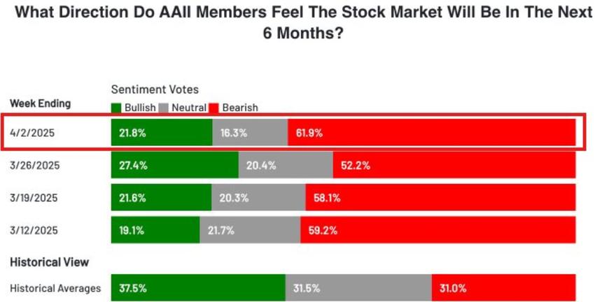 Tâm lý này phù hợp với Khảo sát Tâm lý AAII, báo cáo một triển vọng bi quan đáng kinh ngạc 61.9%. Đáng chú ý, đây là gấp đôi mức trung bình lịch sử của nó là 31.0%.