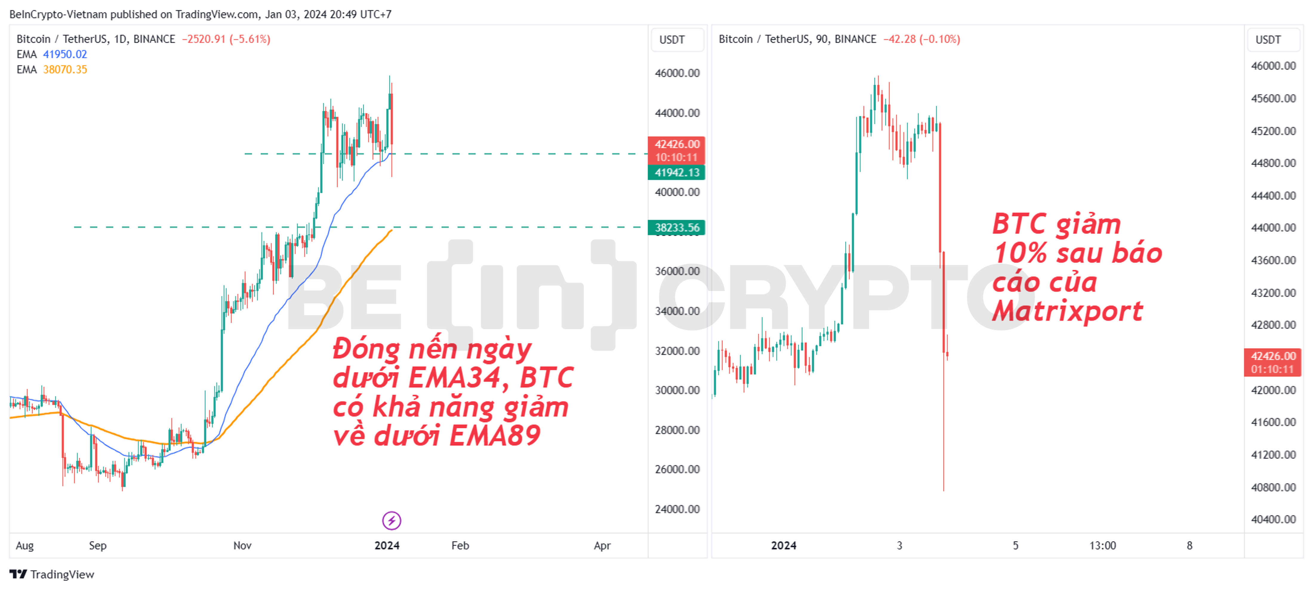 - Trong khung 90m, giá BTC đã giảm nhanh chóng 10% bằng hai nến đỏ lớn. Cùng với đà giảm này, bên bán đã phủ nhận hết toàn bộ nỗ lực của bên mua trong ba ngày đầu năm 2024.