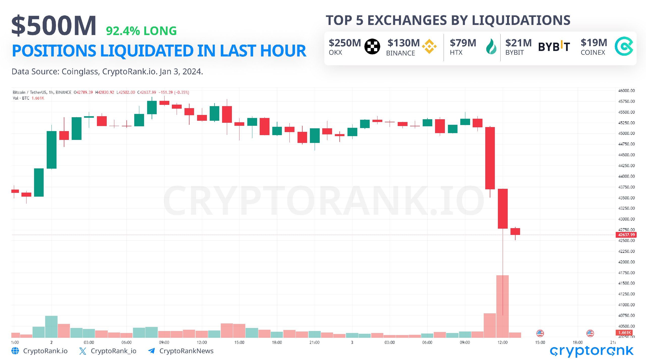 Cryptorank thống kê dữ liệu từ Coinglass trong những giờ qua, cho thấy có khoảng 500 triệu USD đã bị thanh lý cho cả phe Long lẫn phe Short.