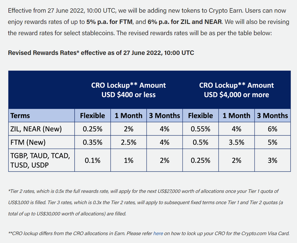 Trong thông cáo cập nhật về chương trình Crypto Earn, Crypto.com loại bỏ 15 Altcoin. Đáng chú ý nhiều Altcoin nổi tiếng đã bị loại khỏi danh sách, một số stablecoin bị điều chỉnh lãi suất.