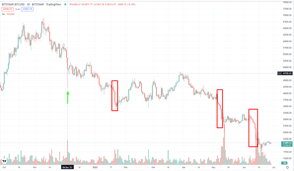 Lấy ví dụ: Biểu đồ hằng ngày cho thấy thanh nến thể hiện áp lực bán mạnh được kéo bằng lực mua lớn vào ngày 4/12/2021. Theo lịch sử ghi nhận ba khoảng thời gian tạo mô hình đáy sau thấp hơn đáy trước (mô hình giảm giá). Nếu số tiền của bạn linh hoạt, bạn có thể bán tiền điện tử nếu bạn ‘sợ hãi’.