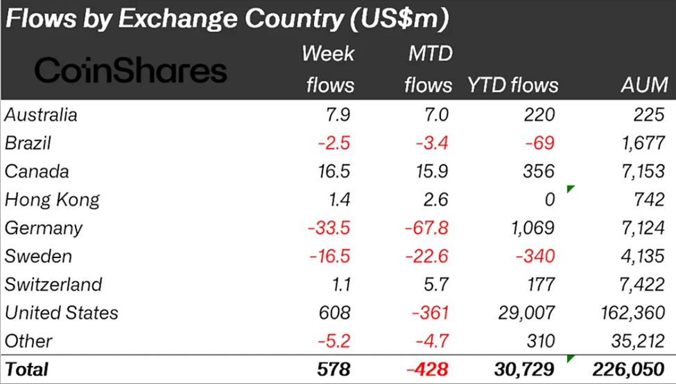 Điều này cho thấy sự hứng thú xung quanh việc đưa vào đã vượt qua tâm lý tiêu cực từ FOMC và những lo ngại kinh tế vĩ mô. Mỹ là nước đi đầu, chiếm phần lớn dòng tiền vào crypto tuần trước.