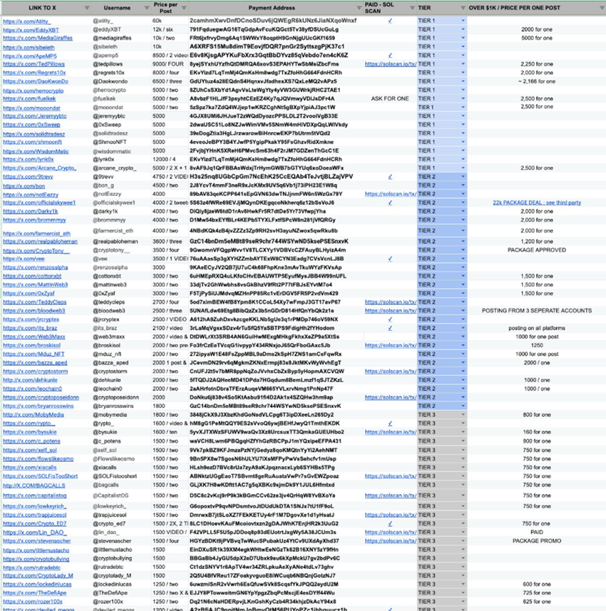 Một bảng giá chi tiết địa chỉ ví của hơn 200 influencer và các thỏa thuận quảng cáo cho thấy trong số hơn 160 tài khoản chấp nhận chiến dịch, chưa đến năm tài khoản tiết lộ bài đăng của họ là quảng cáo.