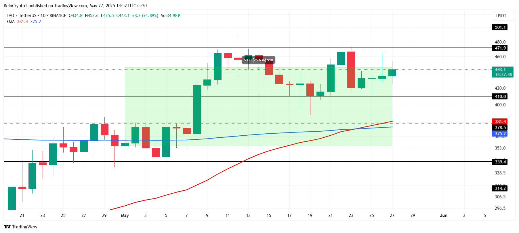 Mục tiêu ngay lập tức của TAO là vượt qua mức kháng cự 471 USD. Vượt qua rào cản tâm lý quan trọng này có thể kích hoạt một đợt tăng giá lên 501 USD, thu hút nhà đầu tư mới và tăng cường niềm tin của thị trường vào tiềm năng của altcoin này.