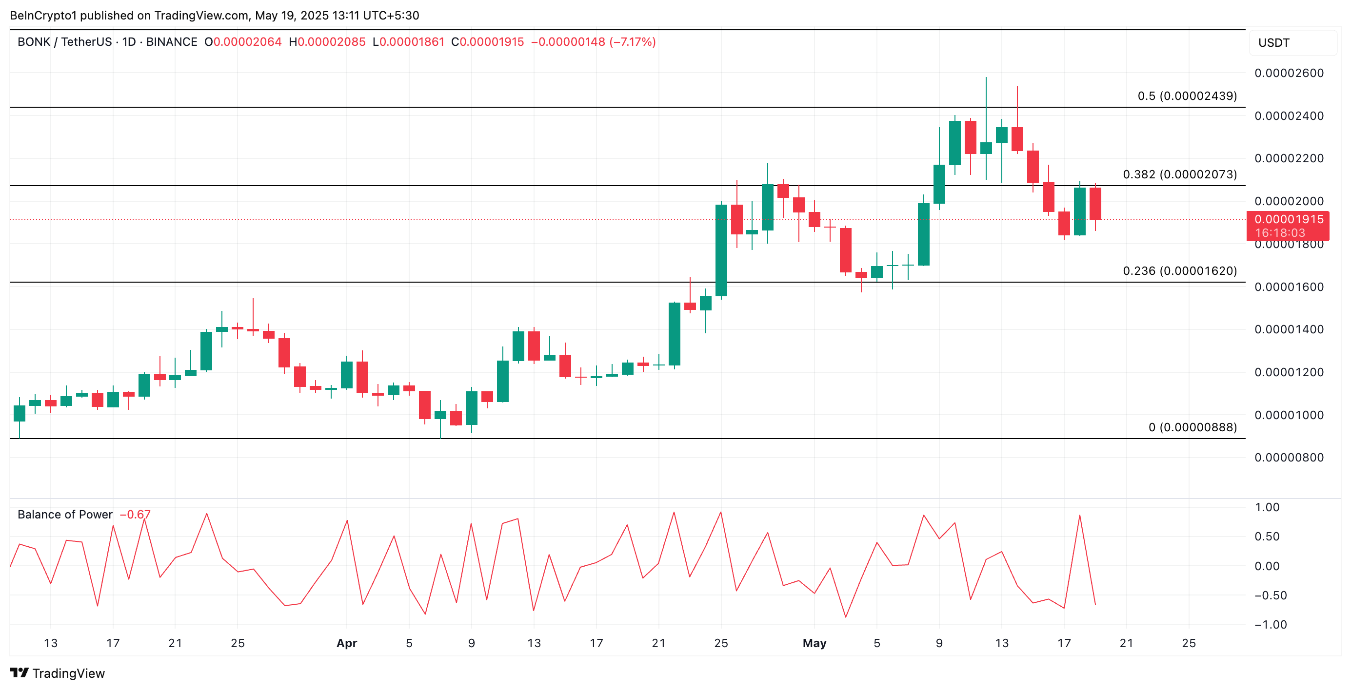 Nếu hoạt động bán mạnh hơn nữa, nó có thể đẩy giá của BONK xuống 0.000016 USD.