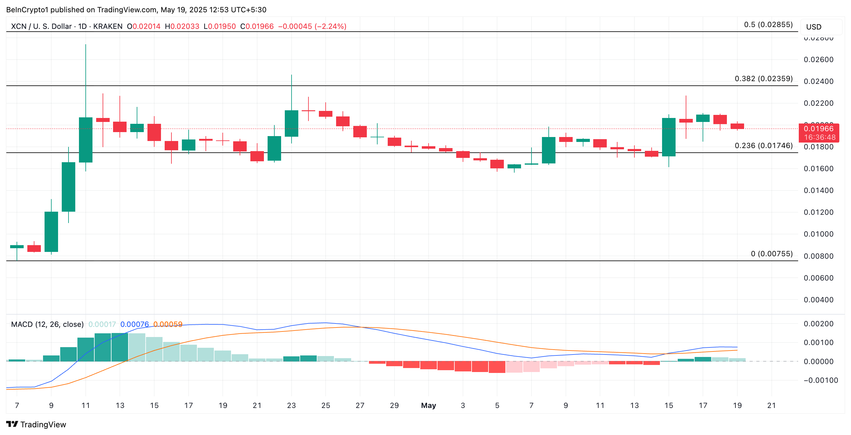 Trên biểu đồ hàng ngày, các chỉ số từ Moving Average Convergence Divergence (MACD) cho thấy khả năng tiếp tục tăng trong ngắn hạn. Tại thời điểm viết bài, đường MACD của XCN (màu xanh) nằm trên đường tín hiệu (màu vàng) và các đường zero.