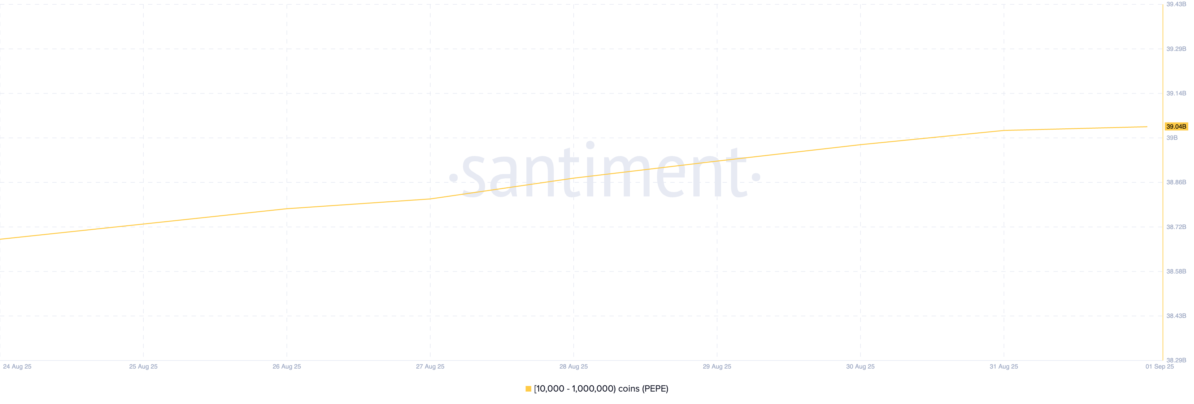 Coin meme PEPE dựa trên Solana đã nổi lên như một lựa chọn hàng đầu trong số các cá voi tiền điện tử đang tìm kiếm lợi nhuận trong tháng 9. Dữ liệu on-chain cho thấy kể từ ngày 24/08/2025, các nhà đầu tư lớn với ví chứa từ 10,000 đến 10 triệu PEPE đã tích lũy 360 triệu token.
