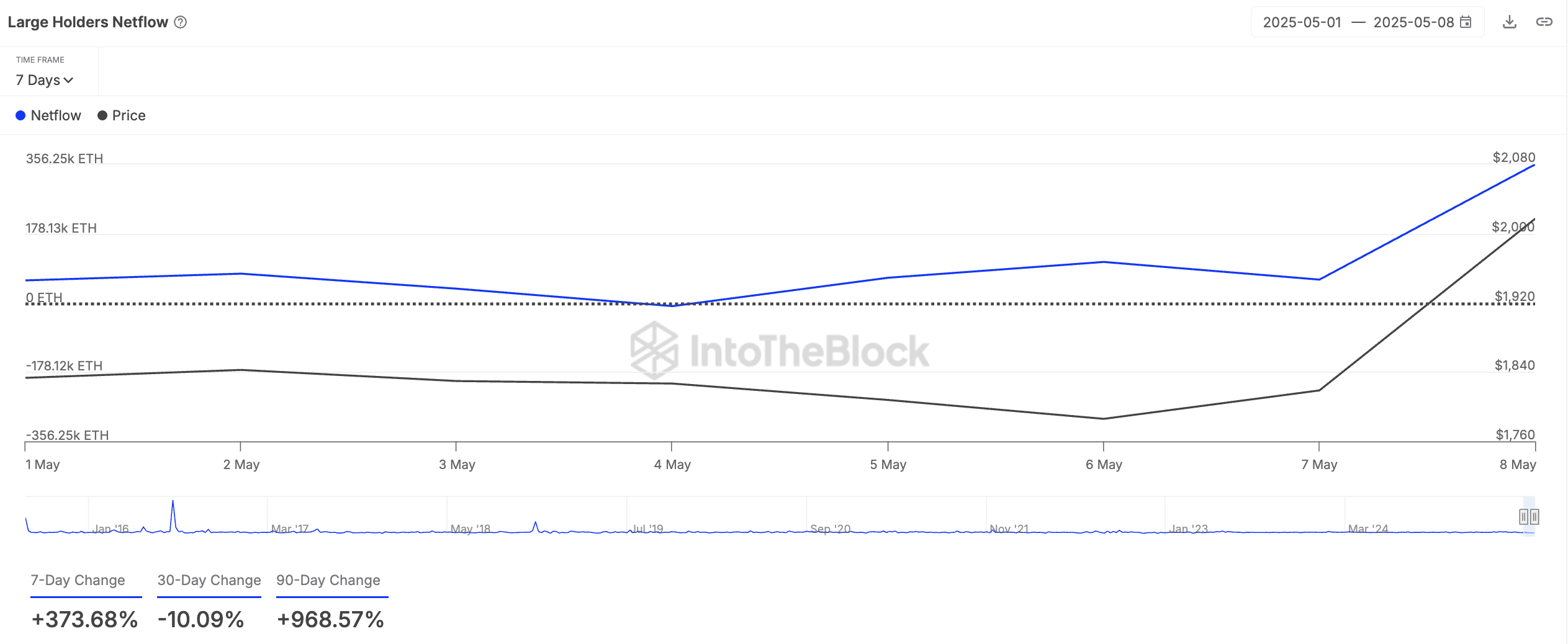 Những yếu tố này đã giúp khôi phục động lực tăng giá, và các cá voi ETH đang tận dụng cơ hội. Theo IntoTheBlock, dòng tiền ròng của các nhà đầu tư lớn của coin này đã tăng 374% trong bảy ngày qua.