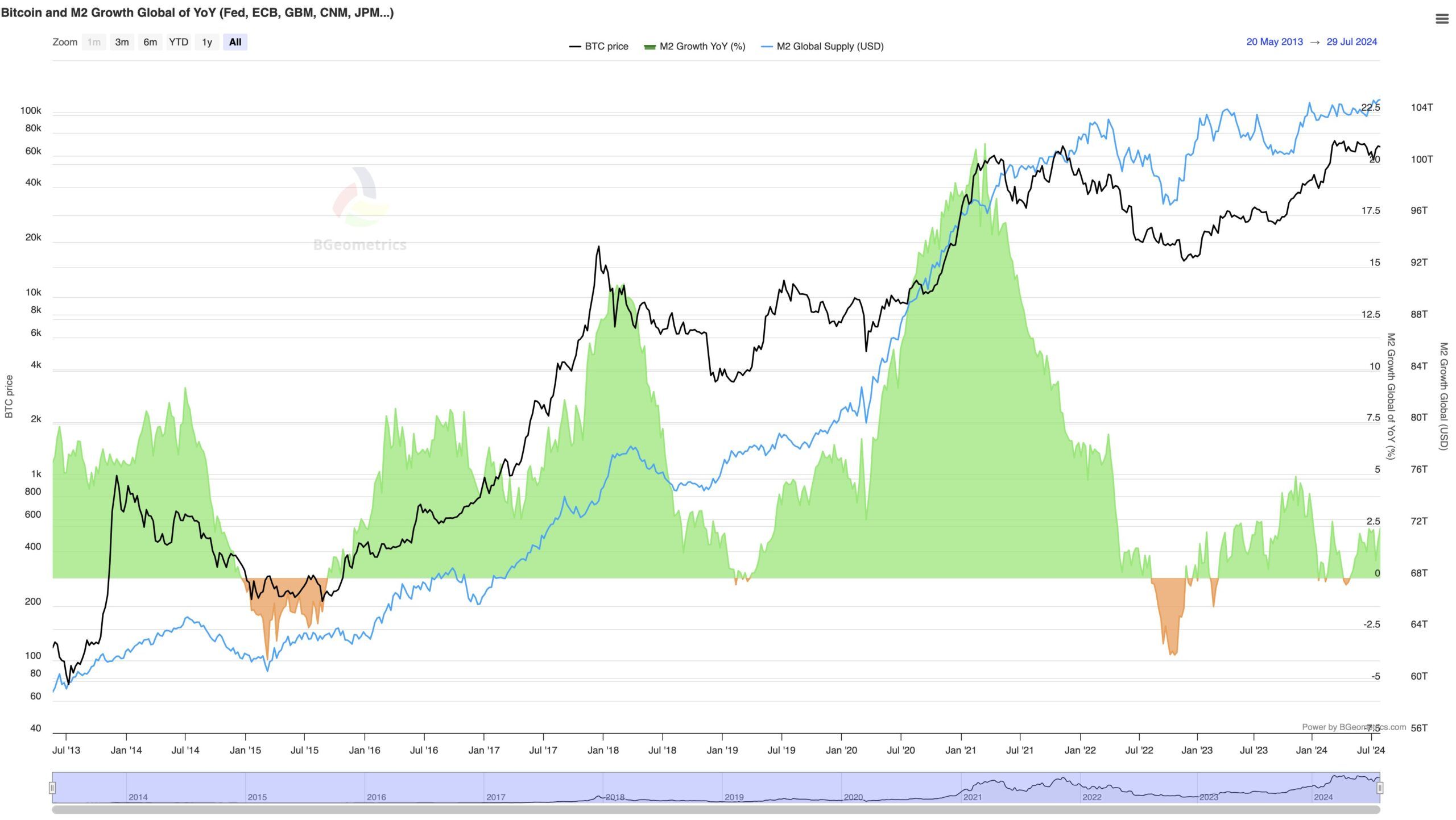 Nguồn cung M2 tăng thường là dấu hiệu dài hạn để nhà đầu tư kỳ vọng giá cổ phiếu hoặc các tài sản đầu tư sẽ tăng giá. Trong đó, Bitcoin và nguồn cung M2 toàn cầu thường được các phân tích chú ý vì mối tương quan trong suốt lịch sử Bitcoin.