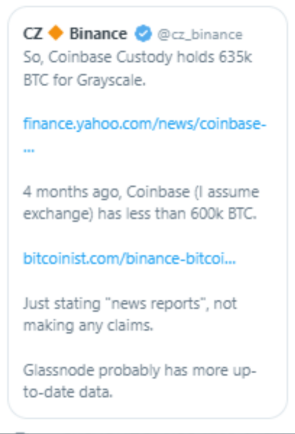 Trong một tweet hiện đã bị xóa, CZ đã thu hút sự chú ý đến các tuyên bố của Coinbase về dự trữ BTC. Đầu tiên là một tuyên bố từ CEO Coinbase Custody, Aaron Schnarch, nói rằng công ty đã nắm giữ 635,000 BTC thay mặt cho Grayscale Bitcoin Trust (GBTC). Thứ hai là trong một nội dung đã được công bố 4 tháng trước đó rằng Coinbase hiện nắm giữ ít hơn 600,000 BTC. Những lo ngại này càng trở nên trầm trọng hơn, đặc biệt là sau khi Grayscale, từ chối đưa ra bằng chứng về khoản dự trữ của mình.