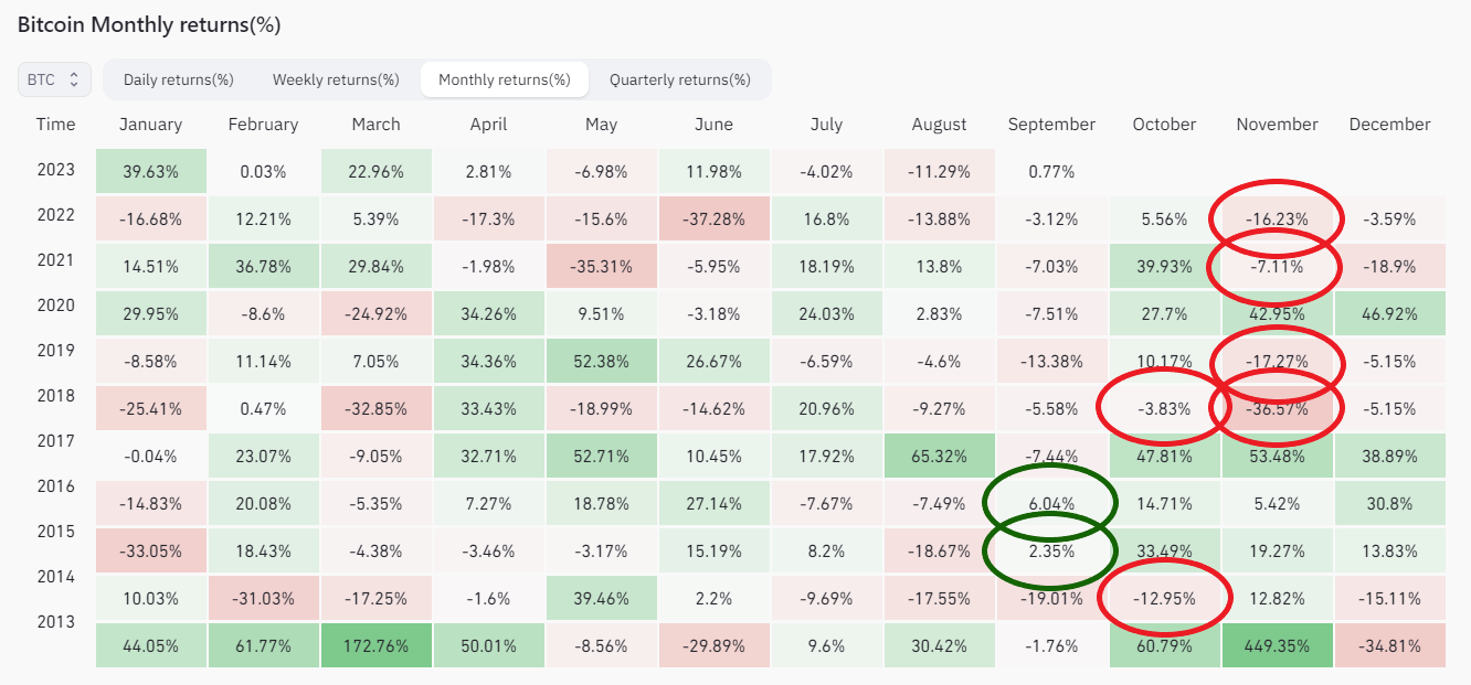 - Tiếp theo, người ta có thể xem lợi nhuận hàng tháng của giao dịch Bitcoin. Theo quan sát của CryptoBirb, tháng 9 là tháng đỏ nhất trong năm. Chỉ trong hai năm – 2015 và 2016 – tháng tạo ra lợi nhuận rất nhỏ, lần lượt là 2.35% và 6.04%. Ngược lại, hai tháng tới lại hoàn toàn khác. Cho đến nay, tháng 10 chỉ khép lại trong sắc đỏ hai lần – vào năm 2014 (-12.95%) và 2018 (-3.83%). Mặt khác, tháng 11 đã chìm trong sắc đỏ 4 lần – vào năm 2018 (-36.57%); 2019 (-17.27%); 2021 (-7.11%) và 2022 (-16.23%).