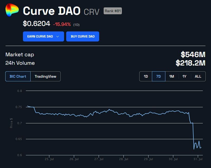 Giá CRV cũng đang chật vật phải đối phó với sự kiện Curve Finance bị hack này. Nó đã giảm 16% trong ngày để giao dịch ở mức 0.623 USD. Hơn nữa, CRV đã mất 23% trong hai tuần qua và vẫn giảm tới 96% so với mức cao nhất mọi thời đại.
