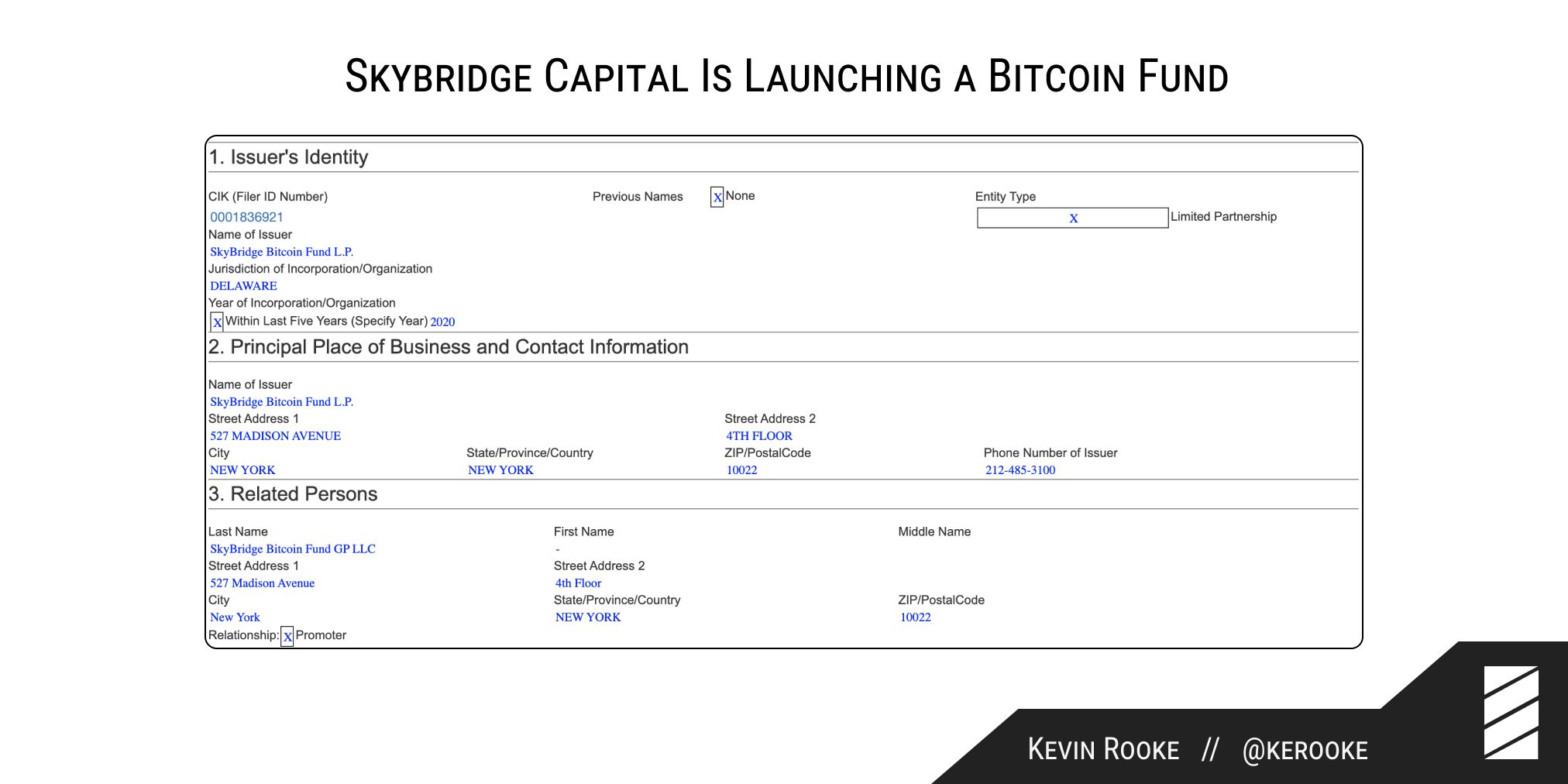 SkyBridge gần đây đã đệ trình thông báo mẫu đơn D lên Ủy ban giao dịch và chứng khoán Mỹ (SEC) để thành lập quỹ SkyBridge Bitcoin Fund mới của mình.
