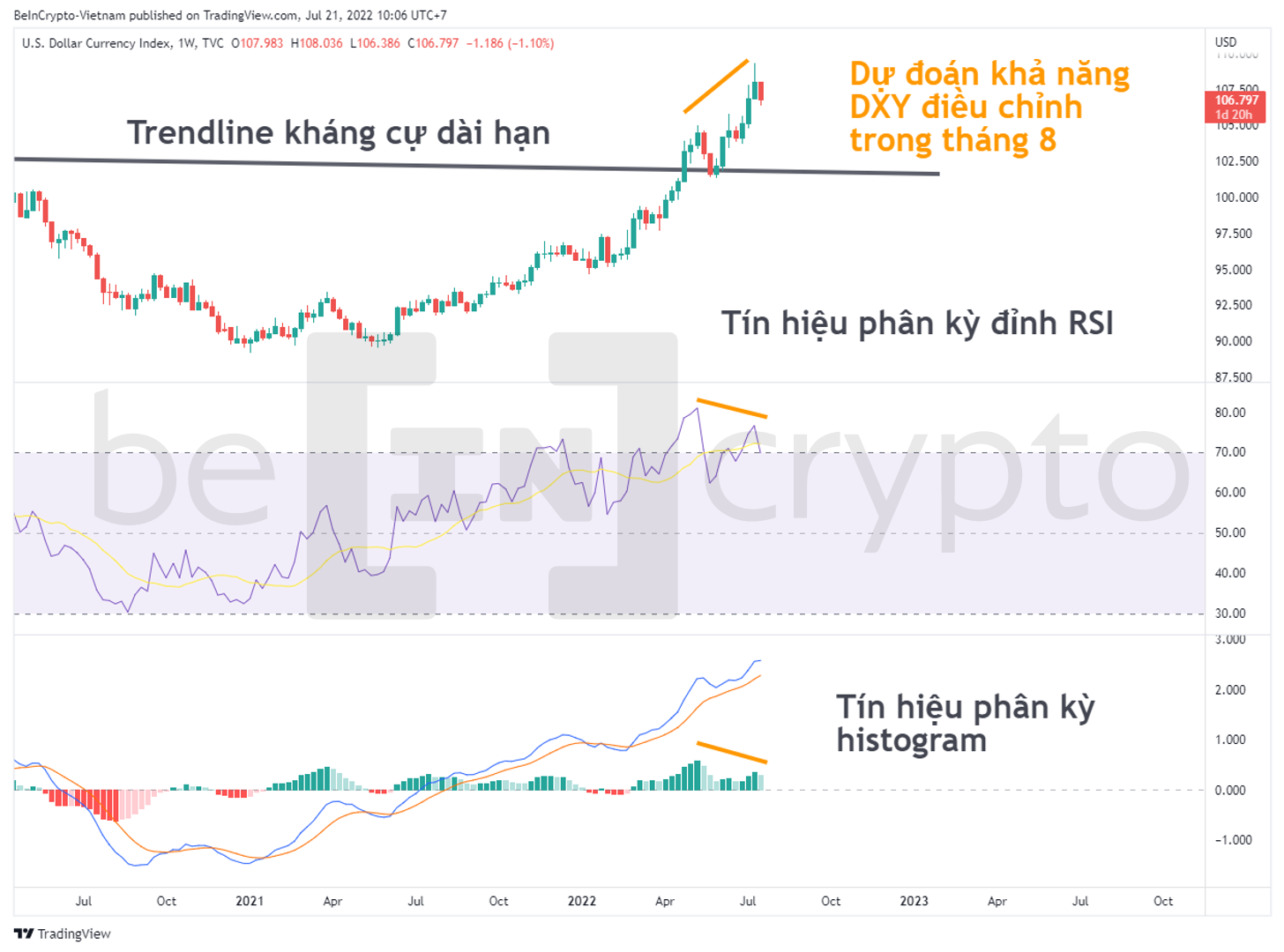 - Bên cạnh đó, tín hiệu phân kỳ đỉnh xuất hiện trên cả hai chỉ báo RSI và Histogram của MACD-H. Điều này càng củng cố thêm dự đoán khả năng DXY sẽ điều chỉnh trong tháng 8.