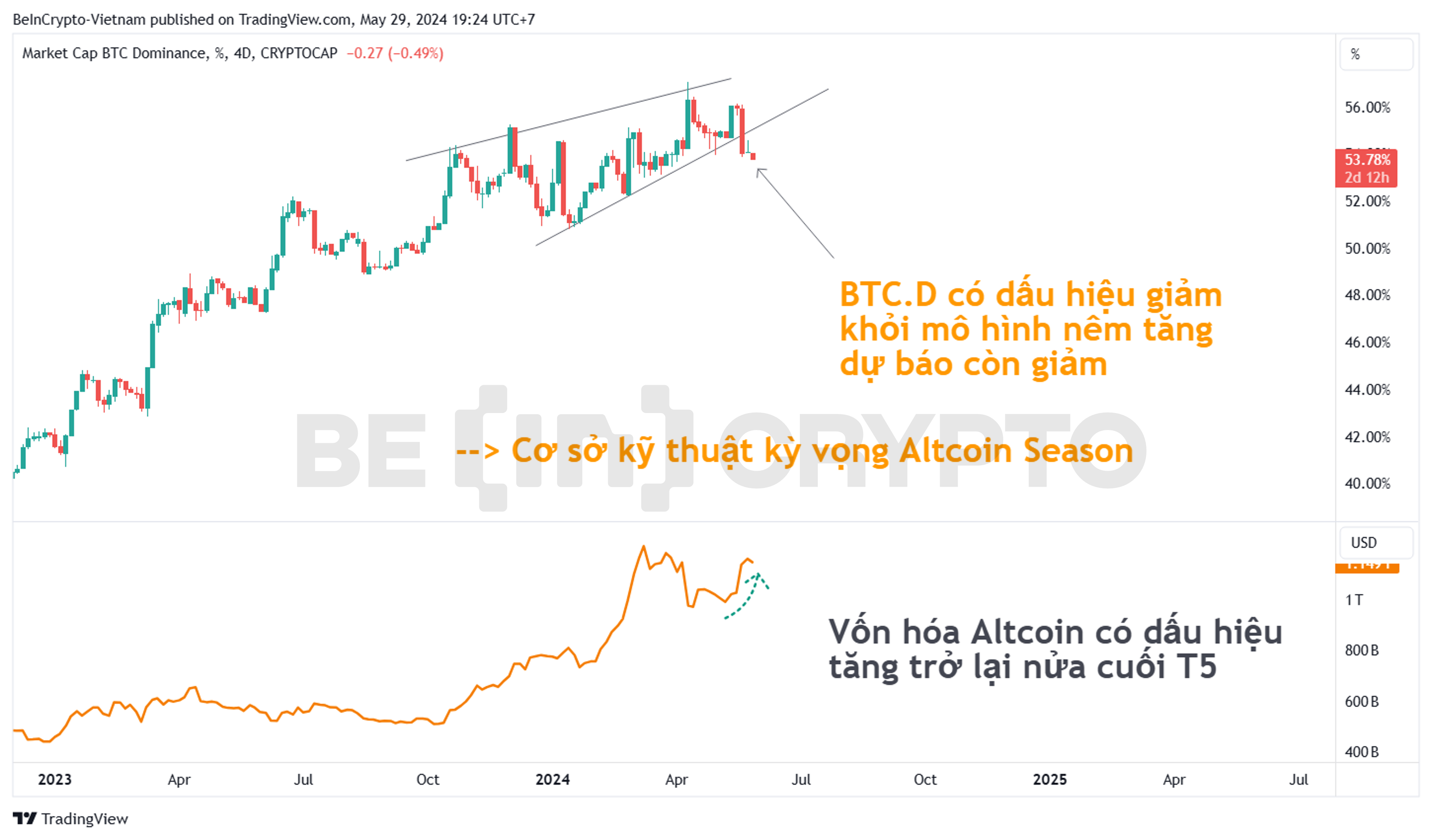 - Đà điều chỉnh của BTC.D đáng nói ở chỗ nó xác nhận tín hiệu breakout khỏi mô hình nêm tăng. Theo lý thuyết phân tích kỹ thuật, mô hình nêm tăng là mô hình dự báo giảm. Target của đà giảm theo mô hình này đang gợi ý BTC.D có thể giảm về vùng 50%. 50% cũng là tương cân bằng giữa vốn hóa Altcoin và Bitcoin.