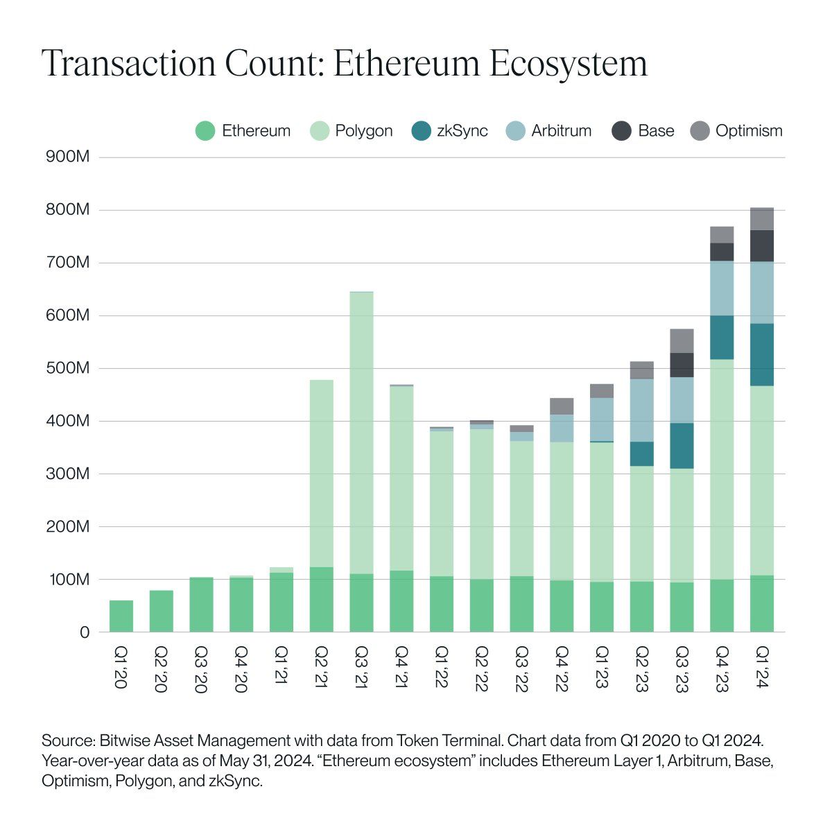 Dữ liệu từ Bitwise Asset Management về số lượng giao dịch trên hệ sinh thái Ethereum cho thấy sự tăng trưởng mạnh mẽ trong quý 1/2024. Trong quý đầu năm, sự sôi động của mạng lưới ETH thể hiện qua hơn 800 triệu giao dịch on-chain được thực hiện. Động lực đằng sau chính là sự thúc đẩy của các giải pháp mở rộng quy mô như Polygon, ZKsync, Arbitrum, Optimism, và Base.