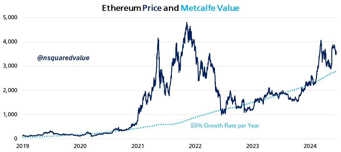 Quan sát biểu đồ trên, có thể thấy nửa đầu 2024, ETH tăng vượt trội so với định giá của Metcalfe. Định luật này đang xác định vùng 2,800 USD là mức giá hợp lý của ETH trong năm 2024. Trong tình huống tiêu cực nhất, giá ETH có thể biến động quanh vùng giá hợp lý này và tiếp tục tăng trưởng theo mô hình định giá Metcalfe.