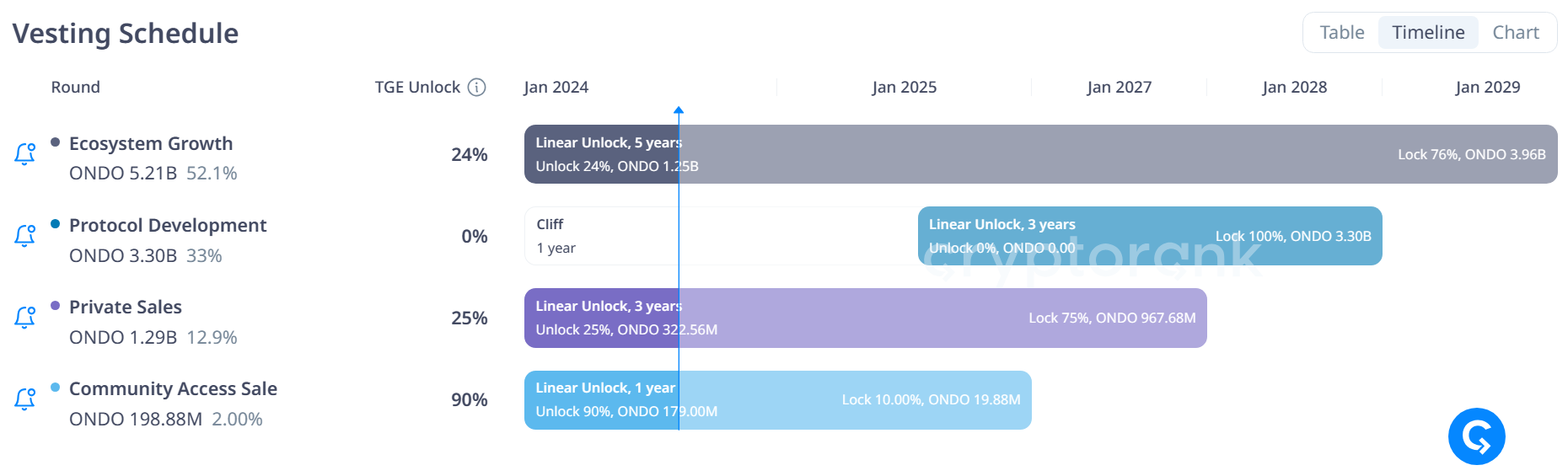 Thêm một lý do nữa để nhà đầu tư kỳ vọng giá ONDO không phải bị ảnh hướng lớn bởi nguồn cung đến 10 tỷ ONDO, đó là lộ trình unlock hợp lý.