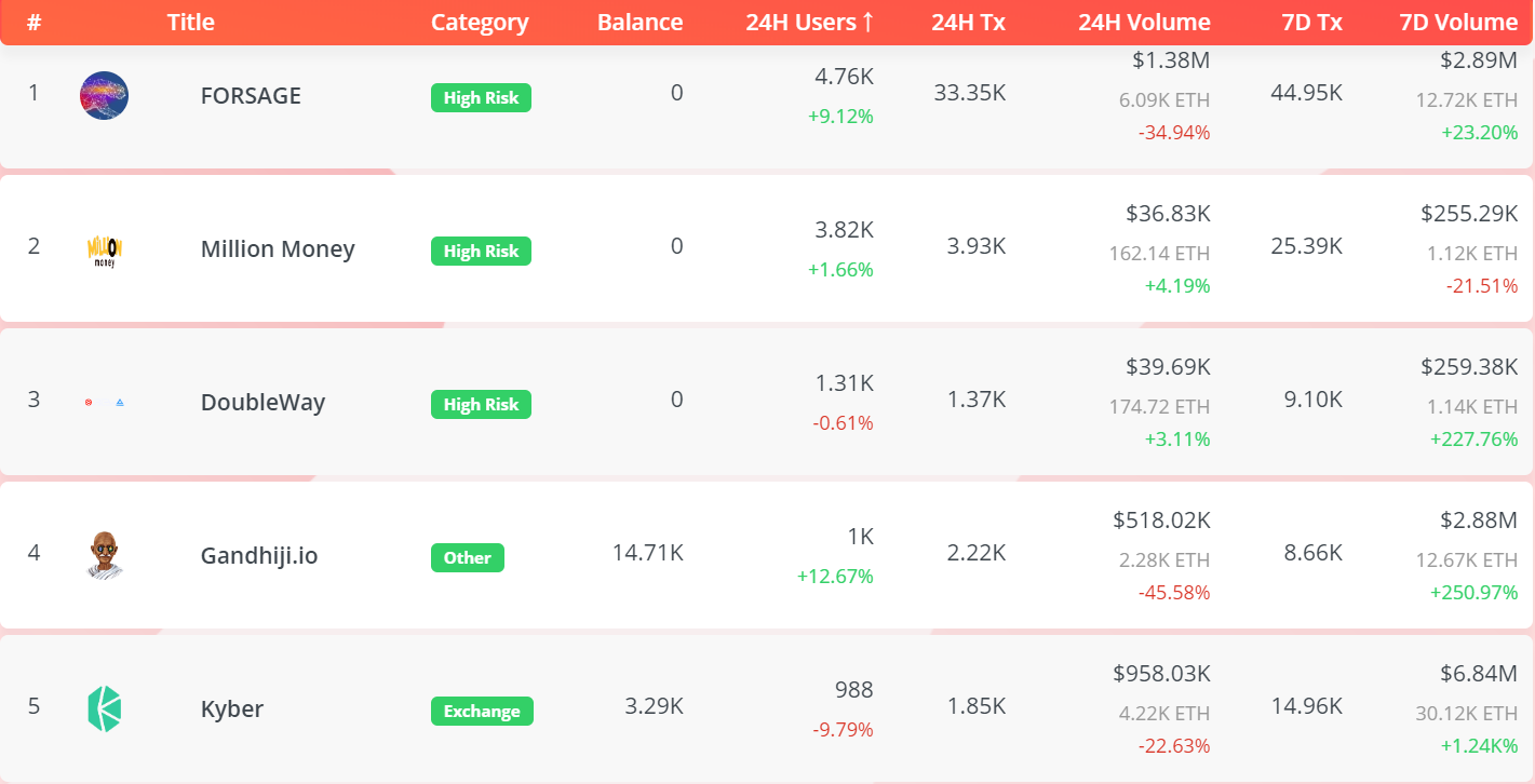 Kể từ ngày SEC đưa ra công bố, hoạt động của Forsage vẫn diễn ra bình thường. Nó vẫn là Dapp trên Ethereum phổ biến nhất, với 4,761 người sử dụng trong 24 giờ qua. Dữ liệu từ DappStats cũng cho thấy, 1,38 triệu đã được Dapp này xử lý trong 1 ngày qua, tương đương hơn 6.000 ETH.