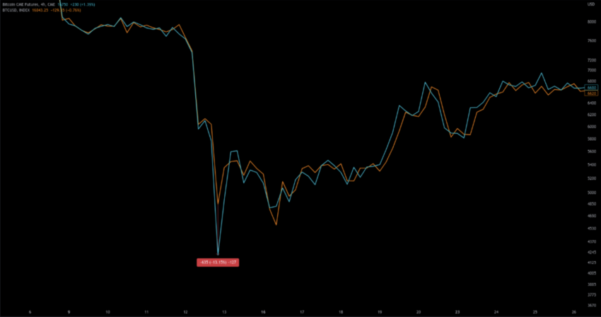 Dữ liệu gần đây từ CryptoQuant cho thấy rằng đã có sự lùi giá nhất quán trong hợp đồng tương lai trên CME và mức chiết khấu (discount) gần như phù hợp với thời điểm BTC tạo 3 đáy trước đó.