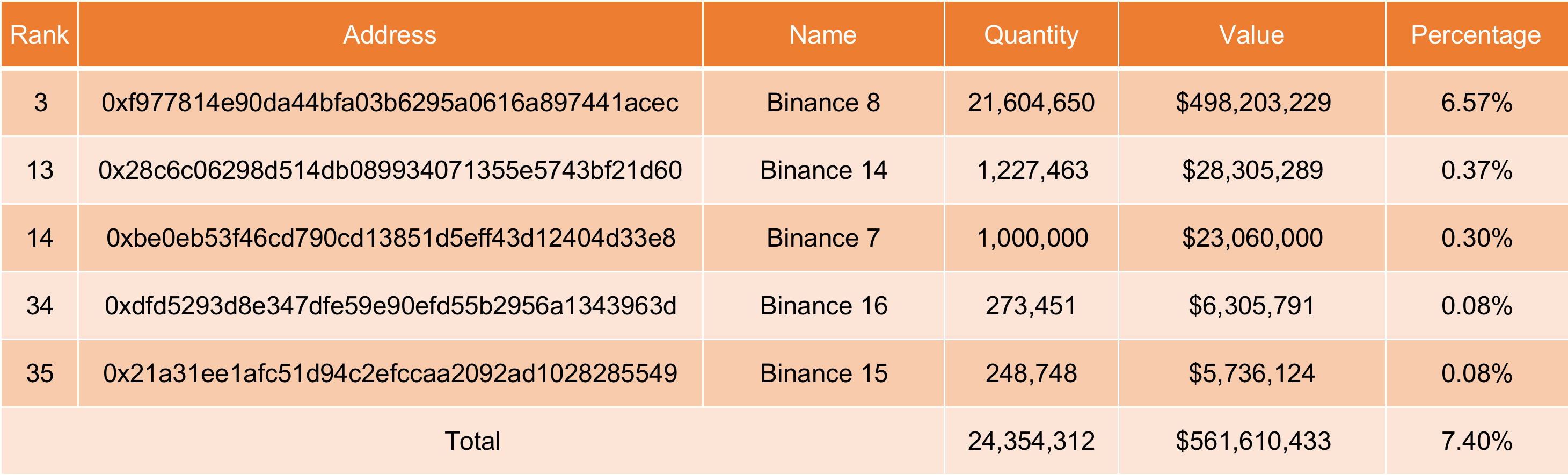 - Đương nhiên, trong 50 ví kia thì phần lớn lượng FTT token cũng chỉ tập trung ở một số địa chỉ nhất định. Ví dụ, Alameda & FTX nắm giữ tổng cộng 245 triệu FTT (khoảng 5,65 tỷ đô la), chiếm 74,51% tổng nguồn cung. Binance nắm giữ tổng cộng 24.35 triệu FTT (khoảng 56 triệu đô la), chiếm 7.4% tổng nguồn cung. Con số Binance nắm giữ gần sát với lượng FTT token được đưa lên sàn Binance nên đây là lý do tại sao người ta tin rằng lượng token đó là của Binance.