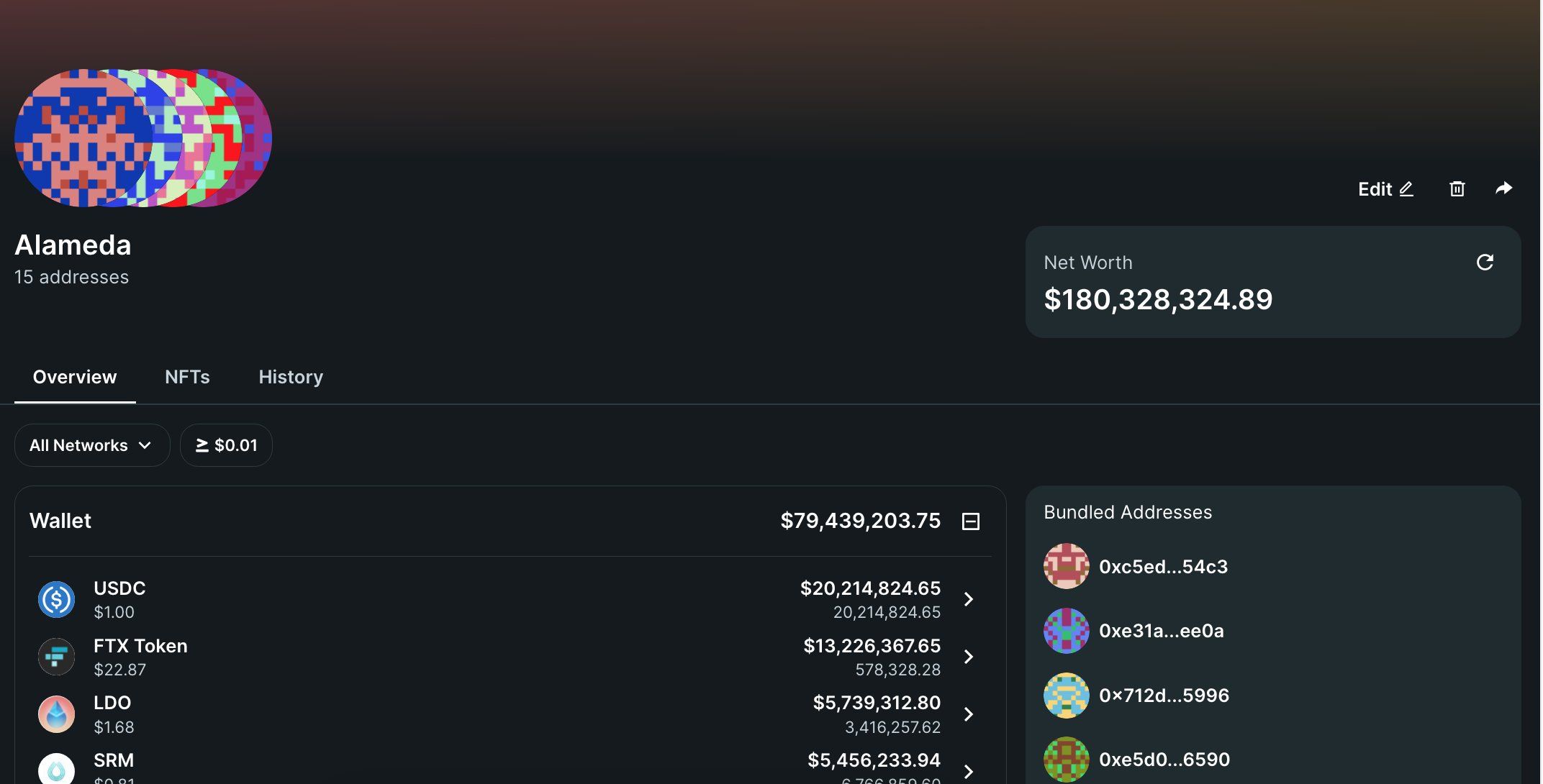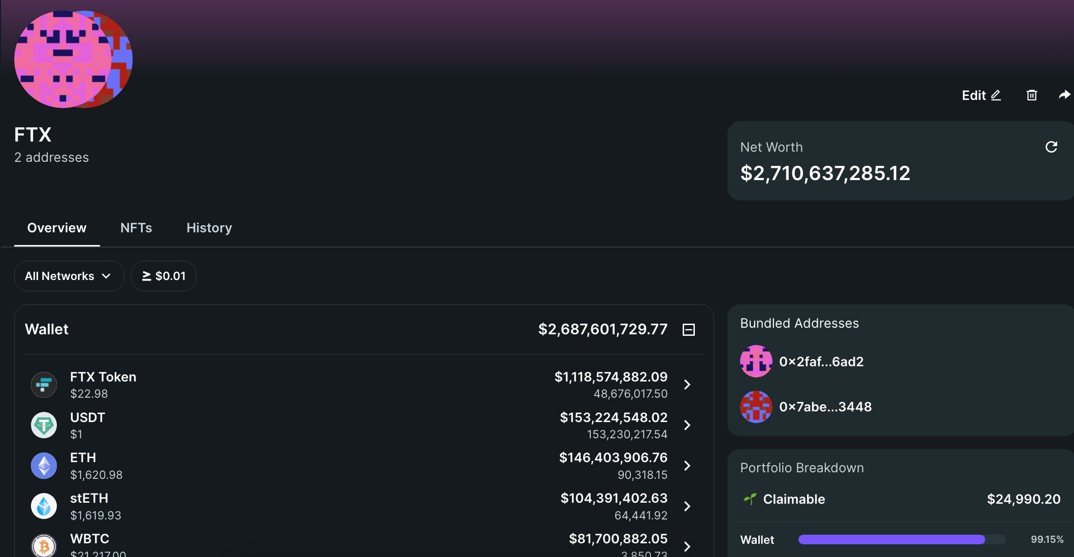 - Tiếp tục phân tích hai ví của FTX và thấy rằng FTX nắm giữ tài sản trị giá 2.71 tỷ USD. Trong đó lượng FTX token trị giá gần 1.2 tỷ USD. Lượng stablecoin là khoảng 240 triệu USD.