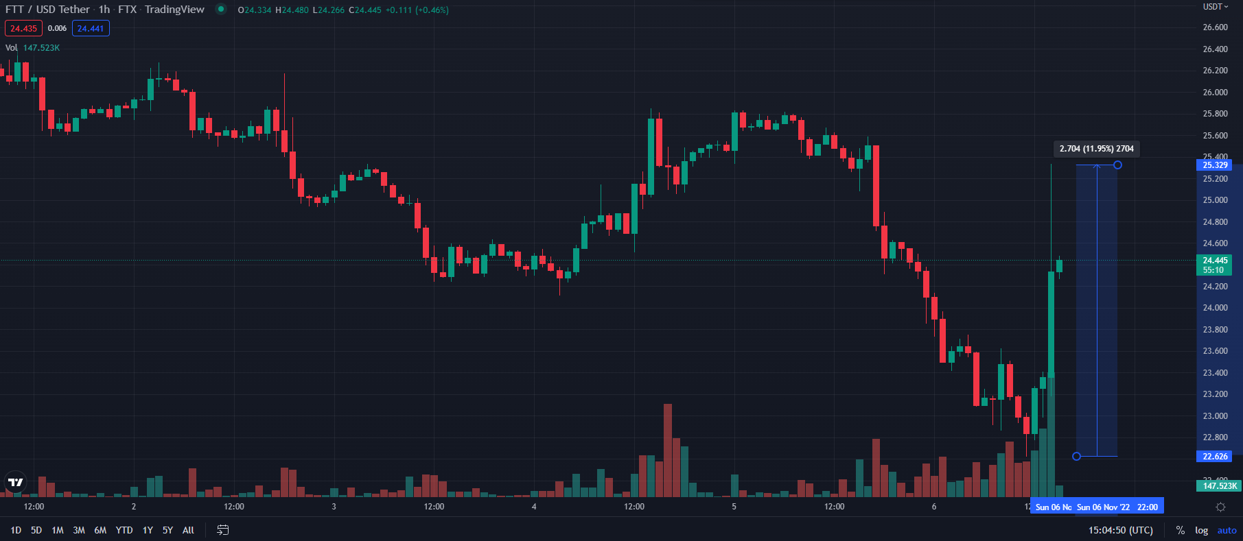 Theo ghi nhận của BeInCrypto, với mức giảm sau khi tin tức một lượng lớn FTT token được chuyển lên Binance, giá FTT đã giảm khoảng hơn 10%. Mức thấp nhất được ghi nhận xuống khoảng 22.62 USD. Tuy nhiên, chỉ vài giờ sau đó, giá FTT đã được đẩy tăng trở lại. Có thời điểm, giá FTX token đã vượt mức 25.334 USD. Xem hình dưới đây.