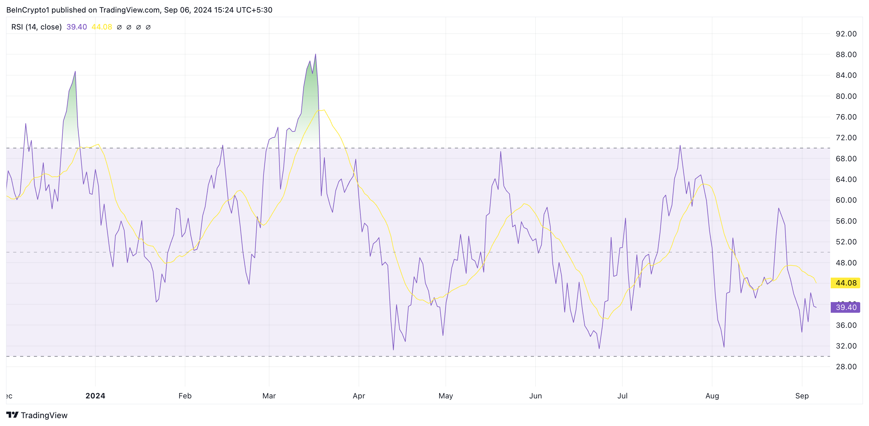 Ví dụ, áp lực mua chung trên thị trường quá yếu để duy trì một cuộc tăng giá, như được chứng minh bởi chỉ số sức mạnh tương đối (RSI) của nó. Chỉ số này, đo lường điều kiện mua quá mức và bán quá mức của SOL, là 39.07 tại thời điểm viết bài. Điều này cho thấy nhiều người tham gia thị trường thích bán Solana của họ hơn là tích lũy thêm coin mới.