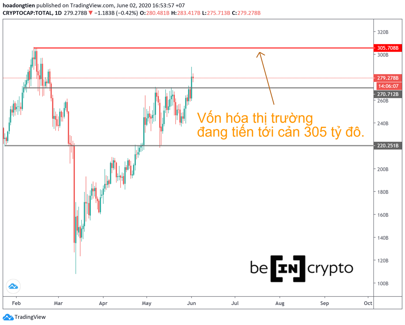 Có thể thấy vốn hóa đã vượt qua kháng cự 270 tỷ đô và đang hướng đến mức kháng cự gần nhất là ở 305 tỷ đô.