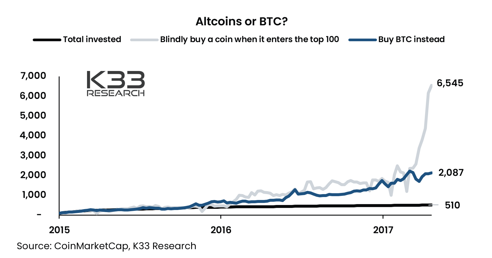 Số liệu của K33 Research cho thấy rằng, trong những mùa uptrend trước, Altcoin cho hiệu suất đầu tư vượt trội hơn Bitcoin rất nhiều lần.