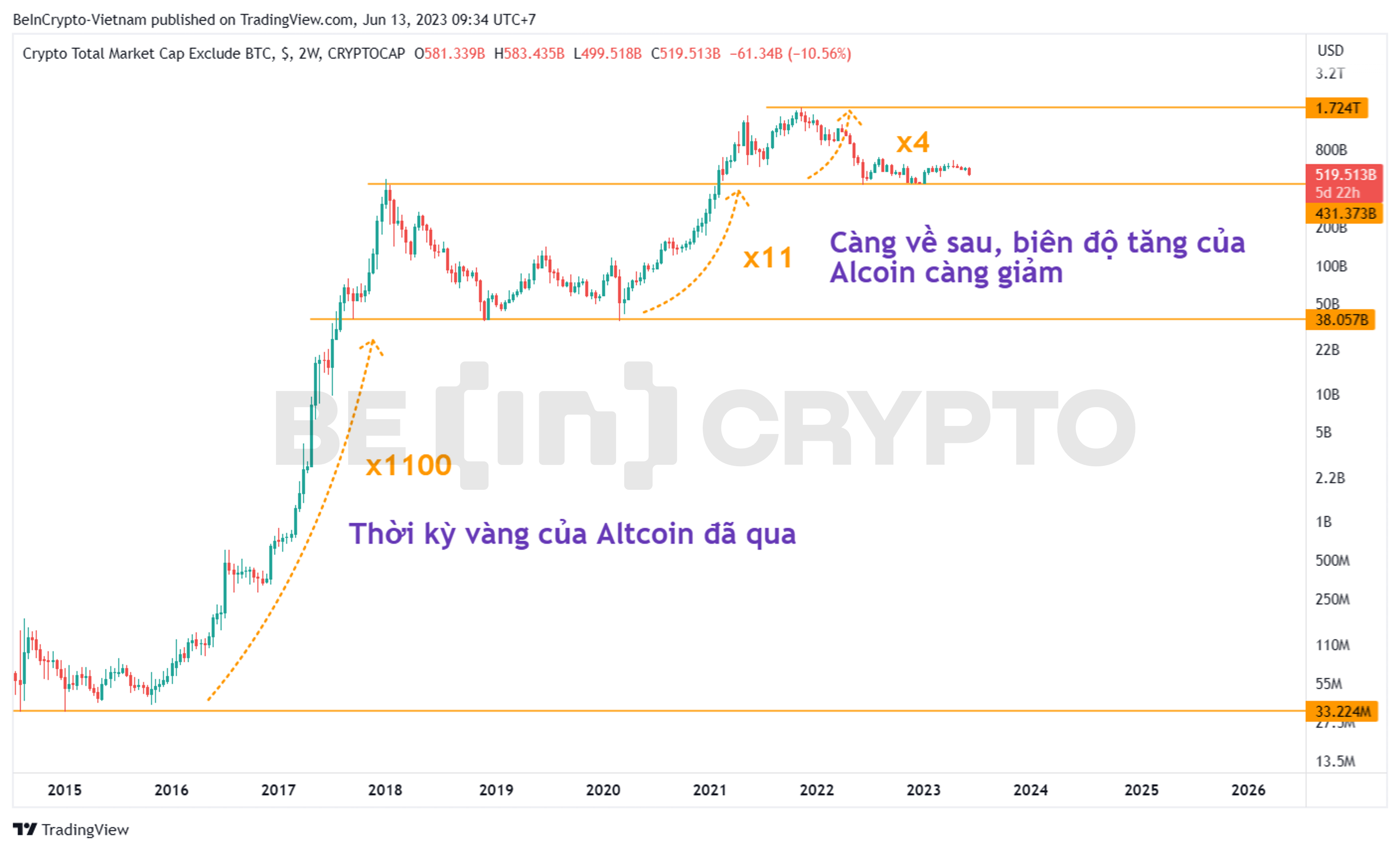 - Giai đoạn 2015 – 2020, vốn hóa mở rộng hơn 1100 lần. Giai đoạn 2020 – 2021, vốn hóa mở rộng 11 lần. Giai đoạn 2021 – 2022 vốn hóa mở rộng 4 lần. Nghĩa là càng về sau, biên độ tăng của Altcoin càng giảm. Và thời kỳ vàng tăng trưởng cả trăm lần của Altcoin đã qua.