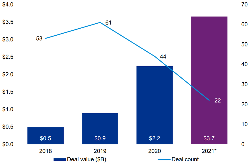 Tổng đầu tư vào blockchain và tiền điện tử cho đến nay gần gấp đôi so với năm 2020. Con số đã nằm ở mức 3.7 tỷ USD, lớn hơn rất nhiều so với mức 2.2 tỷ USD.