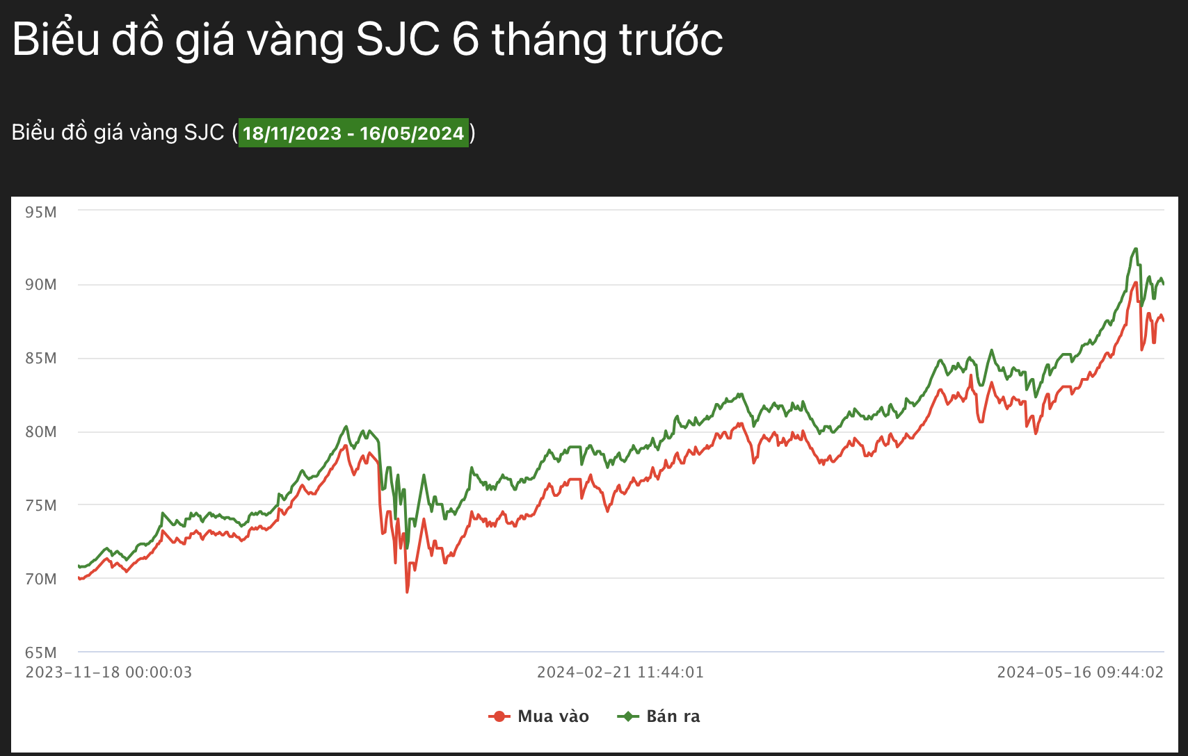 Tương tự, giá vàng DOJI cũng ghi nhận mức tăng từ 1 triệu – 1.2 triệu/1 lượng đối với chiều mua vào và 700,000đ – 900,000đ chiều bán ra. Xét về mặt bằng chung, phần lớn các loại vàng trong nước đều ghi nhận mức tăng mạnh so với ngày trước đó (15/5). Cũng theo ghi nhận của BeInCrypto, chỉ số giá vàng tháng 4/2024 tăng 28.62% so với cùng kỳ năm trước.