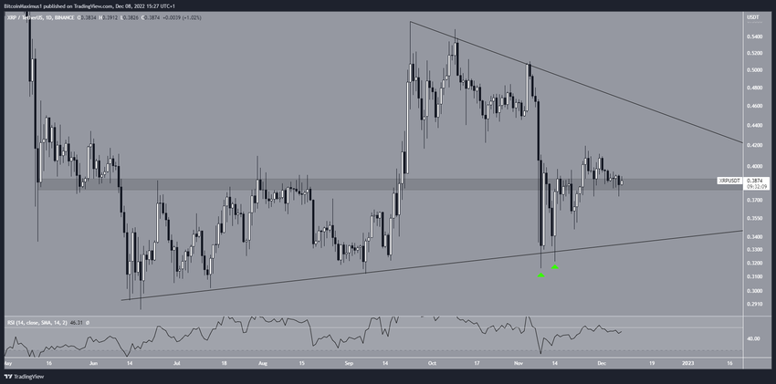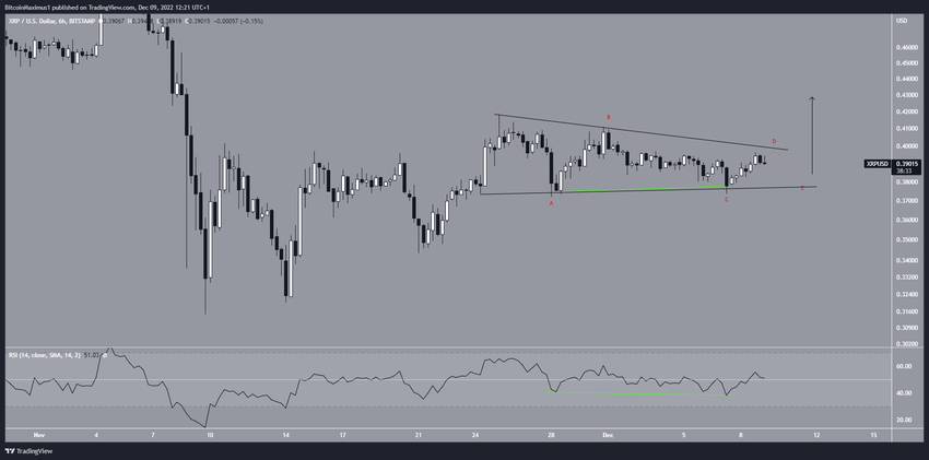 Mặc dù tam giác đối xứng được coi là một mô hình trung lập, nhưng XRP đang thực hiện một chuyển động đi lên. Do đó, một sự đột phá về giá từ nó sẽ là kịch bản có khả năng xảy ra nhất. Sự phân kỳ tăng giá trong chỉ báo RSI hỗ trợ khả năng này. Số lượng sóng phụ cho tam giác được hiển thị bằng màu đỏ. Giá XRP đã tăng trong 24 giờ qua và cố gắng bứt phá. XRP đạt mức cao 0.396 USD trước khi giảm nhẹ.