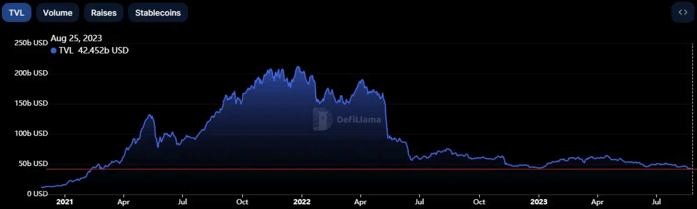 DeFiLlama đưa tin rằng: “Ngày 23/8 đã đánh dấu mức thấp mới cho TVL trong phân khúc DeFi ở mức 37.51 tỷ USD” (không bao gồm các nền tảng staking).