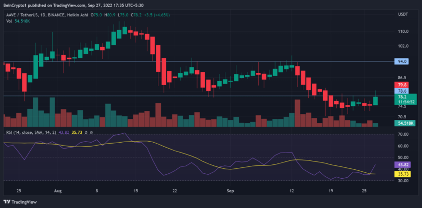 Mặt khác, AAVE đã tăng 7.63% trên biểu đồ hàng ngày khi khối lượng giao dịch trong 24 giờ của nó tăng 17%, đứng ở mức 115 triệu USD. Đối với AAVE, mã thông báo đã đảo chiều tăng vào giữa tháng 9 và chuẩn bị đối mặt với ngưỡng kháng cự quan trọng tiếp theo ở mức 94 USD.