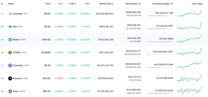 Ngoài UNI, MKR và AAVE cũng có mức tăng trong ngày cao là 11% và 7.63% tại thời điểm viết bài.