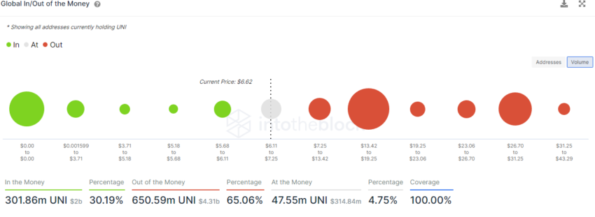 Chỉ báo Global In and Out of Money đã trình bày rằng sau ngưỡng kháng cự 6.6 USD, rào cản nguồn cung quan trọng tiếp theo sẽ ở mức 9.6 USD, nơi hơn 60 triệu mã thông báo UNI được nắm giữ bởi hơn 30 nghìn địa chỉ.