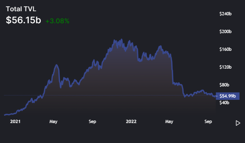 Tại thời điểm viết bài, DeFi TVL đang ở mức 56.15 tỷ USD, giảm hơn 70% so với giá trị 303.8 tỷ USD vào tháng 12/2021.