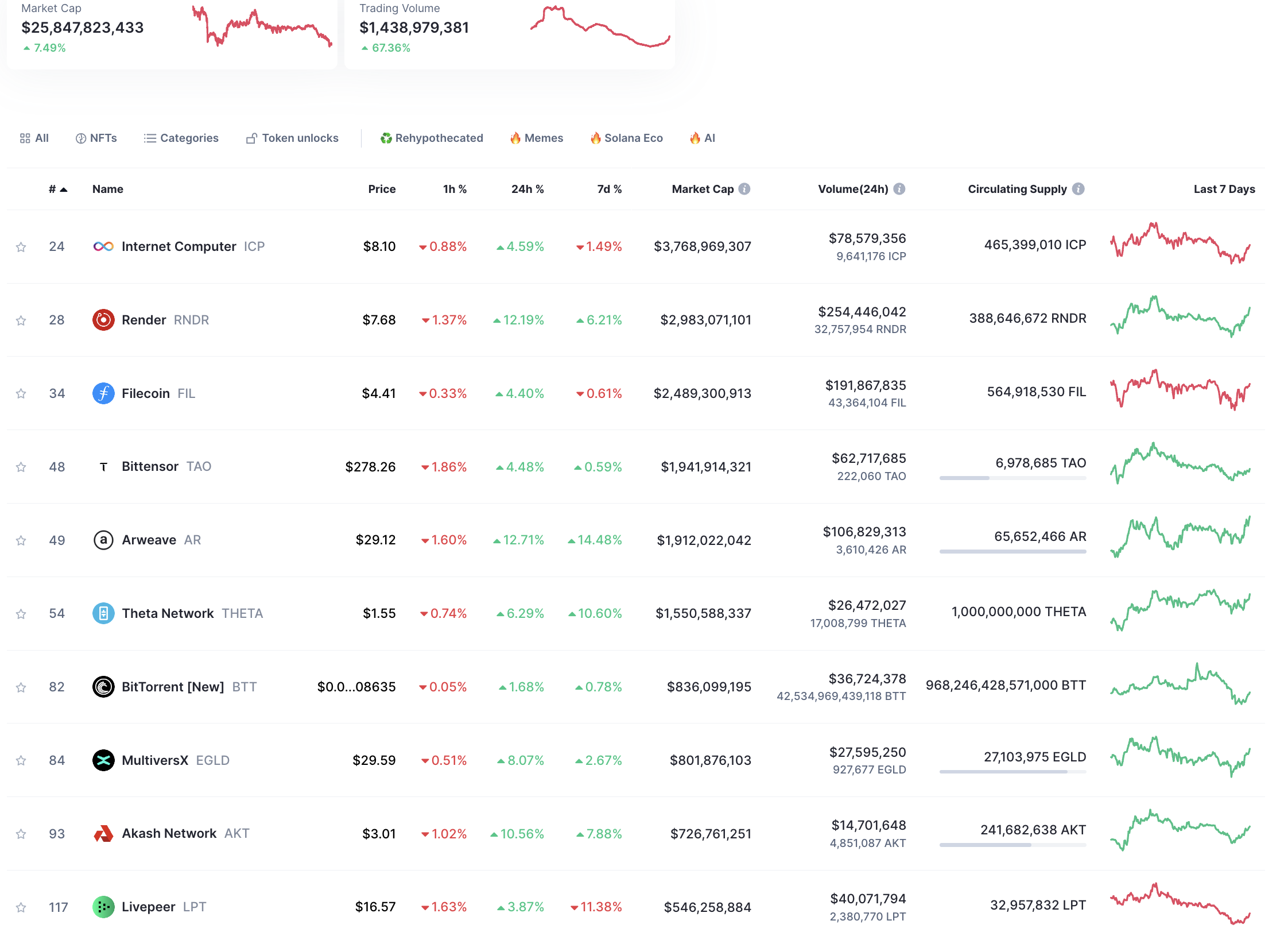 Theo CoinMarketCap, lĩnh vực DePin đã tăng 7.49% trong 24 giờ qua. Tổng vốn hóa thị trường của phân khúc này hiện đạt 25.8 tỷ USD. Trong số 10 token DePin hàng đầu dựa trên vốn hóa thị trường, Arweave (AR) dẫn đầu với mức tăng 12.71% trong 24 giờ qua. Tiếp theo là Render (RNDR), đã tăng 12.19%. Akash Network (AKT) cũng ghi nhận mức tăng hai con số là 10.56%.
