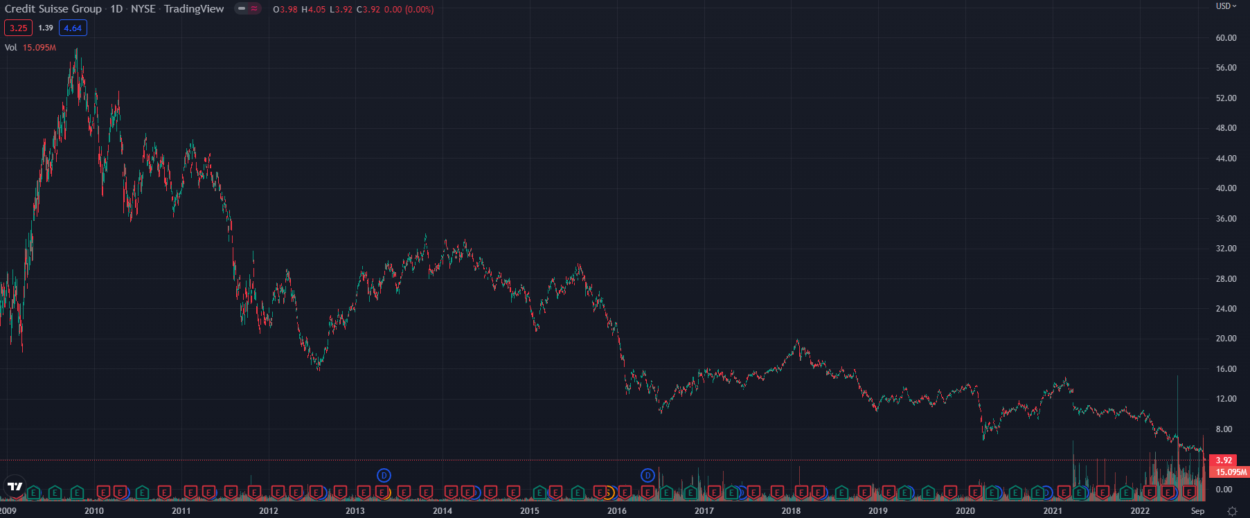 Trên thực tế, tin đồn Credit Suisse phá sản có vẻ như không hoàn toàn đến từ chỉ số CDS lập đỉnh như BeInCrypto vừa chia sẻ ở trên. Chỉ số P/B của Credit Suisse hiện chỉ còn ở mức 0.22, một mức đáng báo động. Giá cổ phiếu của Credit Suisse (CS) cũng đã cho thấy một sự sụt giảm trầm trọng. Theo đó, giá cổ phiếu CS đã giảm mạnh từ mức 14.90 USD vào tháng 2/2021 xuống chỉ còn 3.90 USD ở thời điểm hiện tại (mức giảm hơn 74%). Tổng hòa của các điều này, về mặt lý thuyết, đã cho thấy nguy cơ Credit Suisse phá sản đang dần hiện hữu.