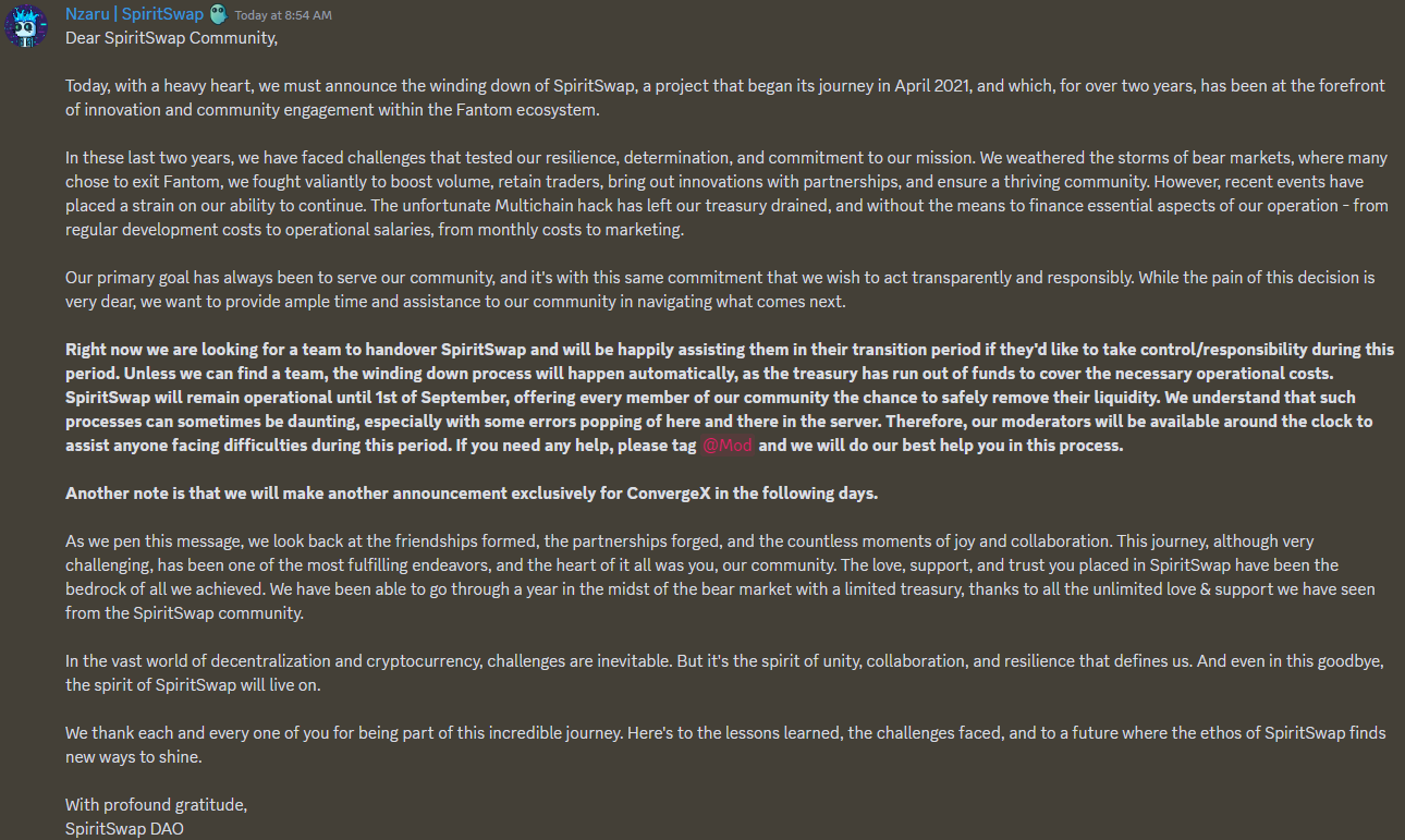 Theo thông báo này, SpiritSwap nói rằng thiệt hại từ vụ hack MultiChain đã khiến ngân quỹ cạn dần. SpiritSwap đã không còn đủ tiền để chi trả chi phí vận hành. SpiritSwap nói rằng họ hiện đang tìm kiếm một nhóm mới để tiếp quản dự án. Nếu không có nhóm nào tiếp quản, SpiritSwap sẽ tự động ngừng hoạt động vào ngày 1 tháng 9.