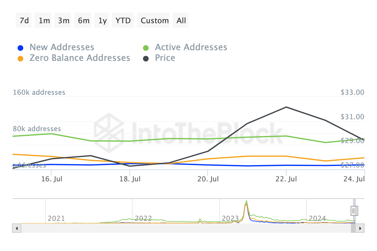 Dữ liệu on-chain từ IntoTheBlock cho thấy số lượng địa chỉ hoạt động và lượng địa chỉ mới trên Avalanche đang tăng lên. Các địa chỉ hoạt động thường là chỉ báo đi trước giá.