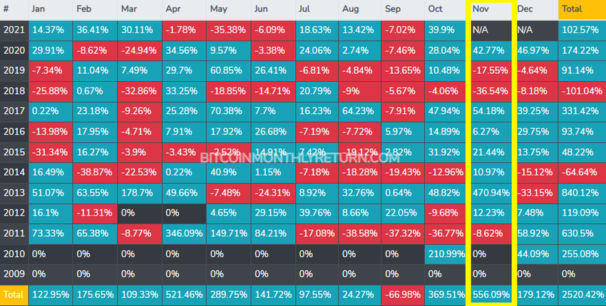 Trong một bài viết trước đây cho thấy Bitcoin thường có 2 quý tăng và 2 quý giảm trong năm. Trong đó, quý 4 hay ba tháng cuối năm thường có mức tăng trưởng dương. Nếu xét dữ liệu tăng trưởng của Bitcoin từ năm 2011 đến năm 2021, thì tháng 11 có hiệu suất tăng trưởng trung bình ấn tượng nhất.