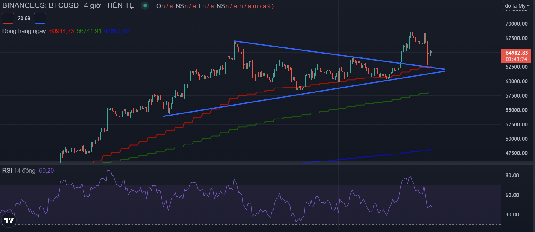 Quan sát biểu đồ khung thời gian bốn giờ, chúng ta phát thảo ra một mô hình tam giác tăng giá. Trong đó, hai cạnh của tam giác được nối từ các đỉnh và các đáy trước đó. Sau khi giá Bitcoin giảm mạnh tạo thành một nến chìm có bóng nến dài. Giả định giá Bitcoin chạm đường hỗ trợ trong phạm vi 61,400 – 61,800 USD. Nếu như Bitcoin đột phá kháng cự sẽ tăng trưởng và có thể thiết lập mức ATH mới.