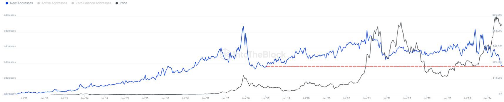 Có thể nói, đây là một tín hiệu phân kỳ đáng chú ý. Giá Bitcoin tăng cao đáng lý ra sẽ hút thêm người dùng mới, và từ đó địa chỉ ví mới sẽ tăng cao tương xứng. Nhưng điều đó đang không xảy ra trong nửa đầu 2024.