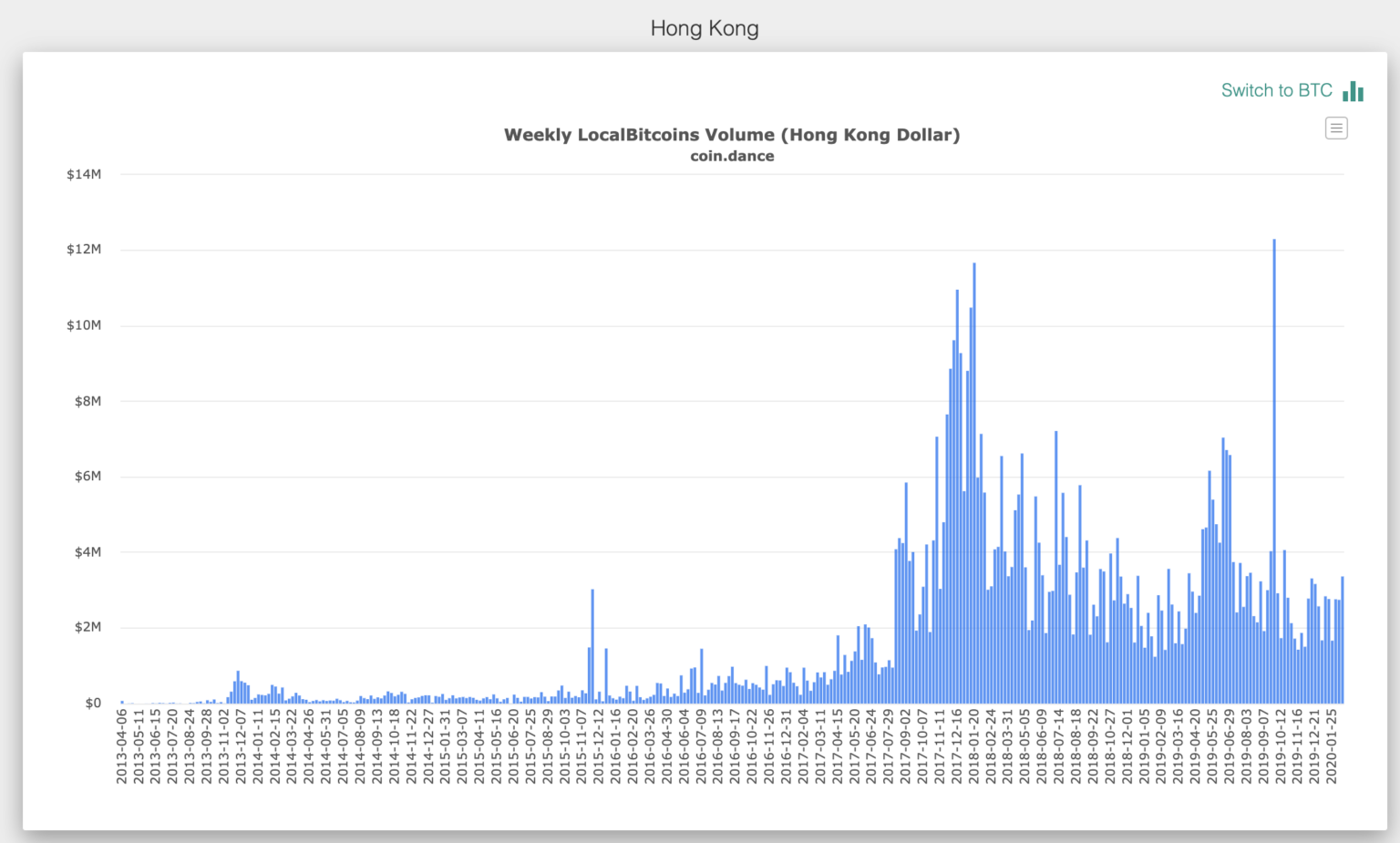 Trong bối cảnh nền kinh tế bất ổn, giao dịch Bitcoin cũng chịu chung số phận. Khối lượng giao dịch LocalBitcoin (thường được sử dụng như một thước đo đánh giá nhu cầu Bitcoin) tại đặc khu này đã bị ngưng trệ và vẫn còn đang trong bế tắc kể từ cuối năm 2019.