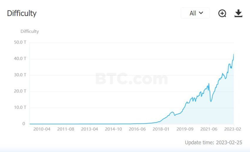 Theo dữ liệu từ BTC.com, độ khó khai thác Bitcoin (mining difficulty) đã tăng lên 43.05 nghìn tỷ trong những giờ đầu ngày 25/2. Độ khó khai thác đề cập đến độ phức tạp của các câu đố hoặc bài toán mà người khai thác phải giải để tạo các block mới trên mạng Bitcoin.